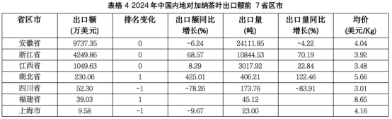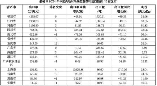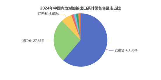 2024年对加纳茶叶出口额前5省区市依次为安徽省 、浙江省 、江西省 、湖北省 、四川省,分别为出口额9737.35万美元、出口额4249.86万美元、出口额1049.63万美元、出口额230.06万美元、出口额52.30万美元,合计占茶叶出口规模的99.68%。