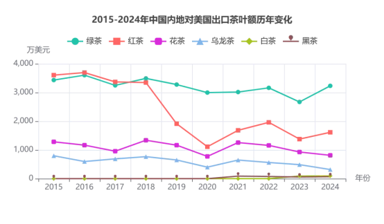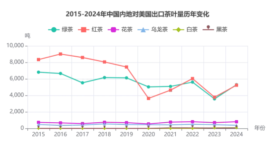从出口量看,绿茶为2024年中国内地-美国最大的出口茶类,出口量5293.77吨,占44.66%;红茶为第二大出口品种,出口量5236.41吨,占44.17%,花茶位居第三,出口量808.08吨,占6.82%。从出口额看,绿茶出口额3232.14万美元,占茶叶出口总额的52.65%;红茶出口额1614.48万美元,占26.30%;花茶出口额812.75万美元,占13.24%;乌龙茶出口额317.23万美元,占5.17%。