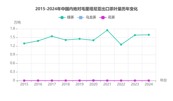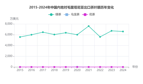 从出口量看,绿茶为2024年中国内地-毛里塔尼亚最大的出口茶类,出口量1.59万吨,占100.00%。从出口额看,绿茶出口额6595.38万美元,占茶叶出口总额的100.00%。
