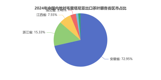 2024年对毛里塔尼亚茶叶出口额前5省区市依次为安徽省 、浙江省 、江西省 、湖北省 、湖南省,分别为出口额4811.58万美元、出口额1011.21万美元、出口额498.08万美元、出口额229.44万美元、出口额34.13万美元,合计占茶叶出口规模的99.83%。