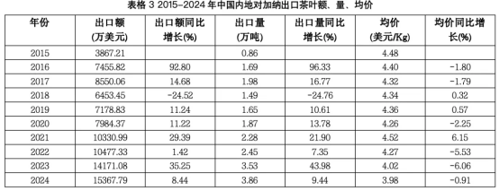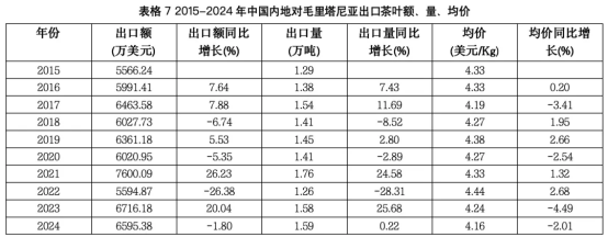 2024年中国内地-毛里塔尼亚茶叶出口量1.59万吨,在所有贸易伙伴中第5,同比增长0.22%;出口额6595.38万美元,位列所有贸易伙伴第4,同比减少1.80%;均价4.16美元/Kg,降幅2.01%。