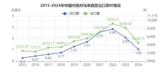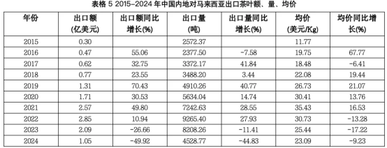 2024年中国内地-马来西亚茶叶出口量4528.77吨,在所有贸易伙伴中第21,同比减少44.83%;出口额1.05亿美元,位列所有贸易伙伴第3,同比减少49.92%;均价23.09美元/Kg,降幅9.23%。