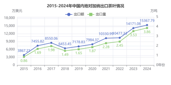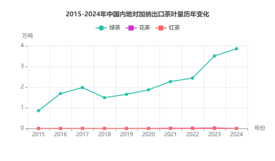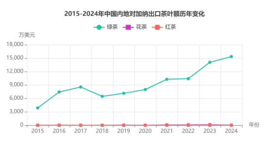 从出口量看,绿茶为2024年中国内地-加纳最大的出口茶类,出口量3.86万吨,占99.92%;花茶为第二大出口品种,出口量32.62吨,占0.08%。从出口额看,绿茶出口额1.53亿美元,占茶叶出口总额的99.86%;花茶出口额20.77万美元,占0.14%。