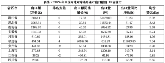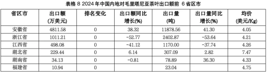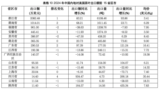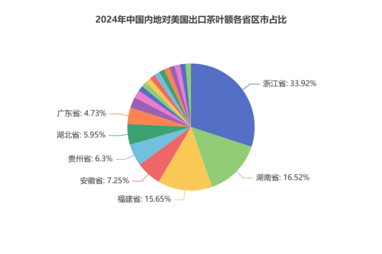 2024年对美国茶叶出口额前5省区市依次为浙江省 、湖南省 、福建省 、安徽省 、贵州省,分别为出口额2082.48万美元、出口额1014.01万美元、出口额961.00万美元、出口额445.41万美元、出口额386.97万美元,合计占茶叶出口规模的79.65%。