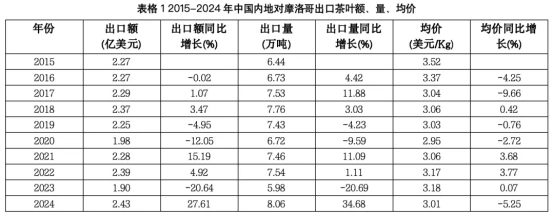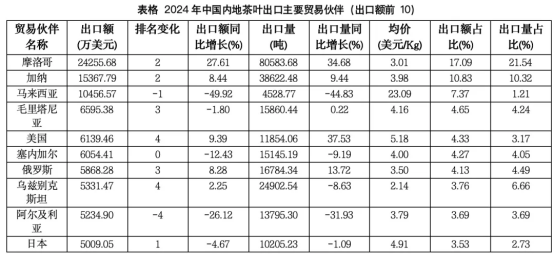 2024年中国内地-摩洛哥茶叶出口量8.06万吨,在所有贸易伙伴中第1,同比增长34.68%;出口额2.43亿美元,位列所有贸易伙伴第1,同比增长27.61%;均价3.01美元/Kg,降幅5.25%。