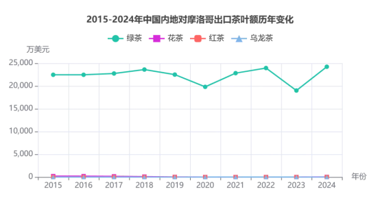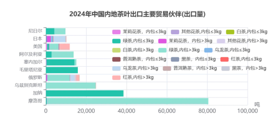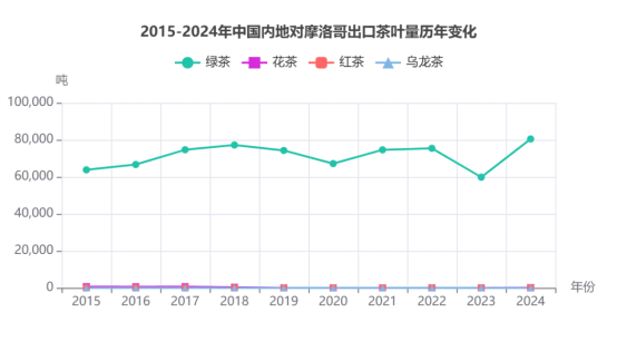 从出口量看,绿茶为2024年中国内地-摩洛哥最大的出口茶类,出口量8.05万吨,占99.85%;花茶为第二大出口品种,出口量112.83吨,占0.14%,红茶位居第三,出口量4.47吨,占0.01%。