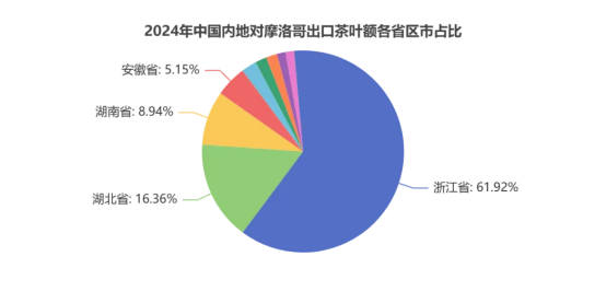 2024年对摩洛哥茶叶出口额前5省区市依次为浙江省 、湖北省 、湖南省 、安徽省 、河南省,分别为出口额1.50亿美元、出口额3967.31万美元、出口额2168.70万美元、出口额1249.38万美元、出口额610.69万美元,合计占茶叶出口规模的94.88%。