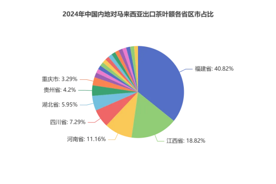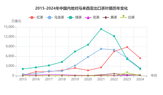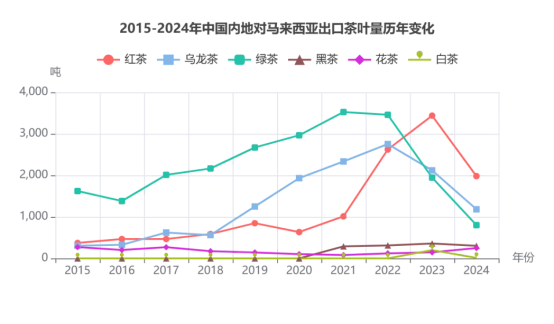 从出口量看,红茶为2024年中国内地-马来西亚最大的出口茶类,出口量1980.80吨,占43.74%;乌龙茶为第二大出口品种,出口量1182.02吨,占26.10%,绿茶位居第三,出口量801.33吨,占17.69%。从出口额看,红茶出口额5420.33万美元,占茶叶出口总额的51.84%;乌龙茶出口额2291.37万美元,占21.91%;绿茶出口额2135.52万美元,占20.42%;花茶出口额329.13万美元,占3.15%。