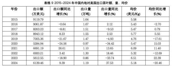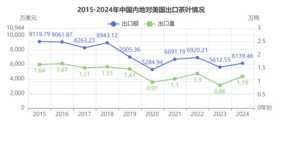 2024年中国内地-美国茶叶出口量1.19万吨,在所有贸易伙伴中第8,同比增长37.53%;出口额6139.46万美元,位列所有贸易伙伴第5,同比增长9.39%;均价5.18美元/Kg,降幅20.46%。