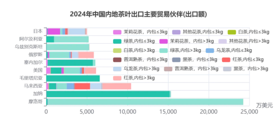 2024年中国内地茶叶出口额前5贸易伙伴依次为摩洛哥 、加纳 、马来西亚 、毛里塔尼亚 、美国,分别为出口额2.43亿美元、出口额1.54亿美元、出口额1.05亿美元、出口额6595.38万美元、出口额6139.46万美元,合计占出口规模的44.26%。出口量前5贸易伙伴依次为摩洛哥 、加纳 、乌兹别克斯坦 、俄罗斯 、毛里塔尼亚,分别为出口量8.06万吨、出口量3.86万吨、出口量2.49万吨、出口量1.68万吨、出口量1.59万吨,合计占出口规模的40.48%。