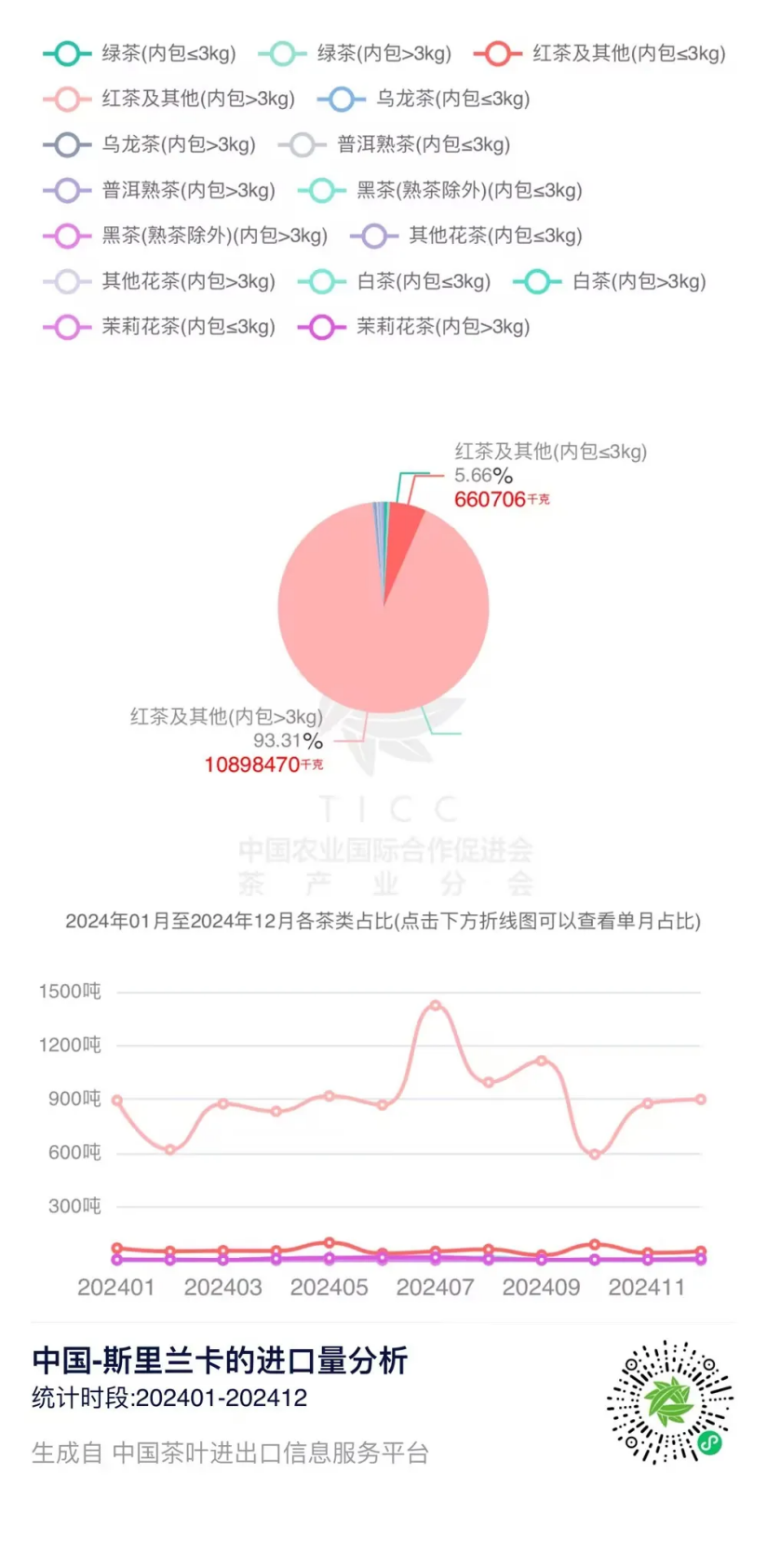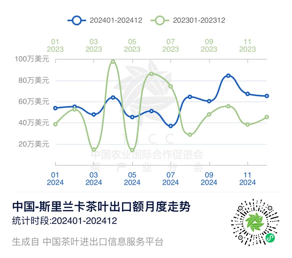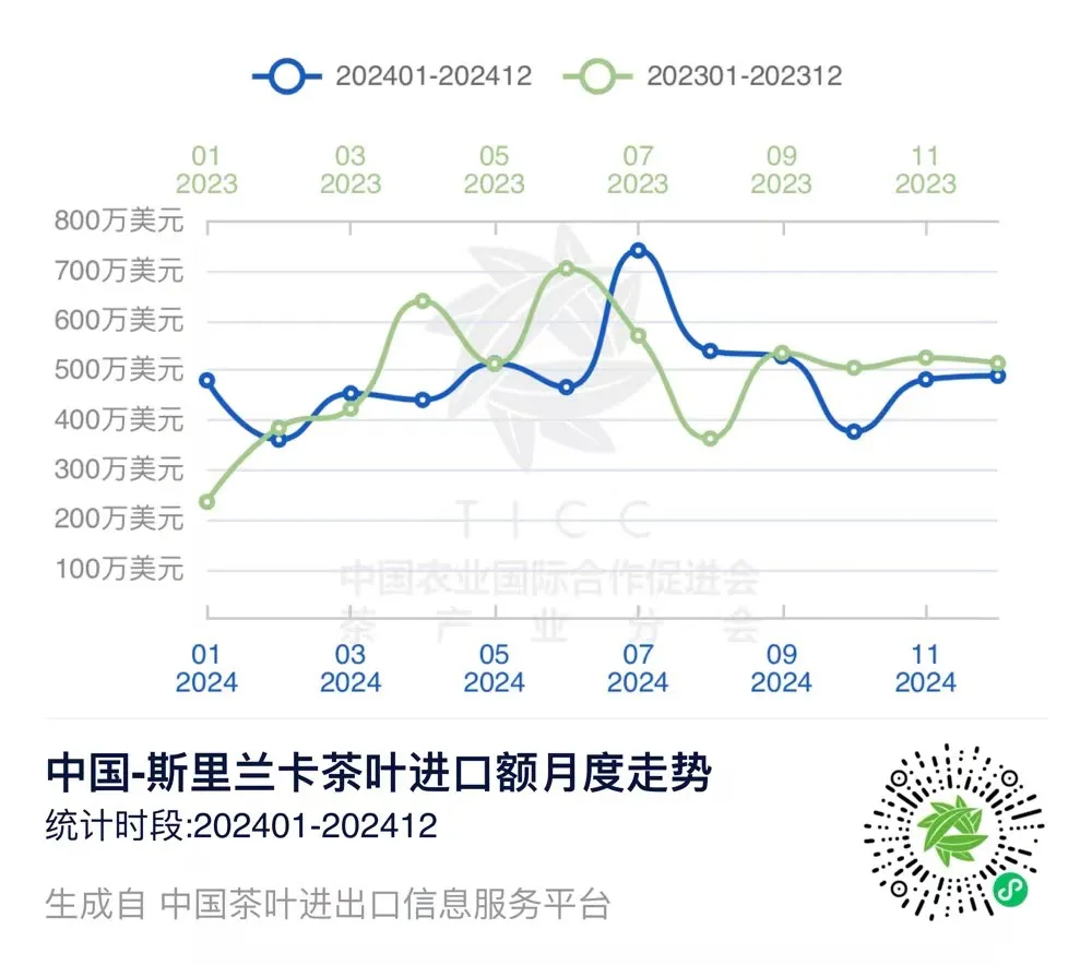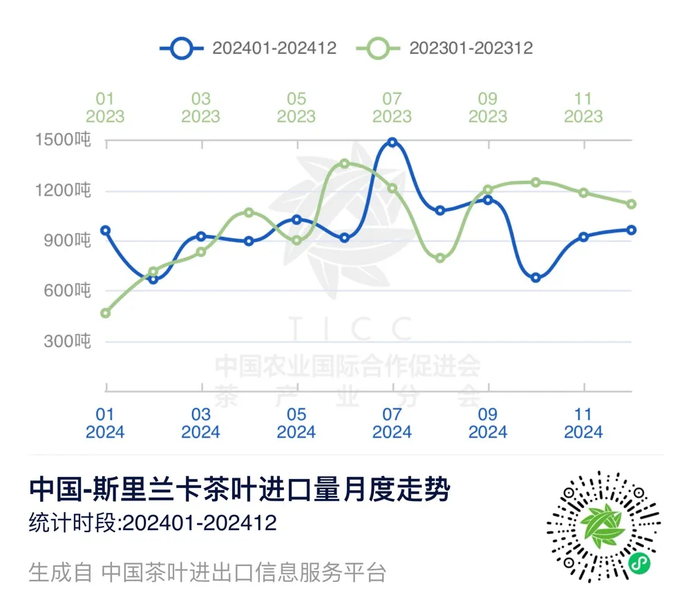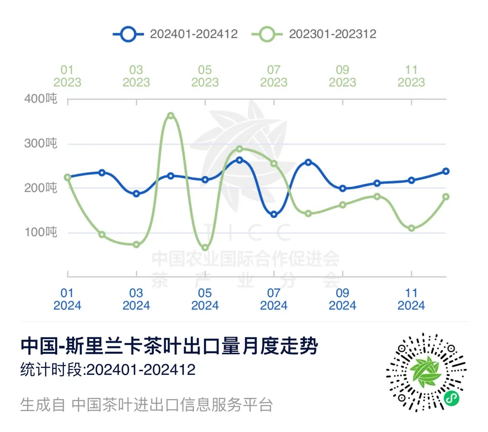 在“中国茶叶进出口信息服务平台”上,我们可以查询到2024年1-12月中国与斯里兰卡的茶叶进出口贸易数据。