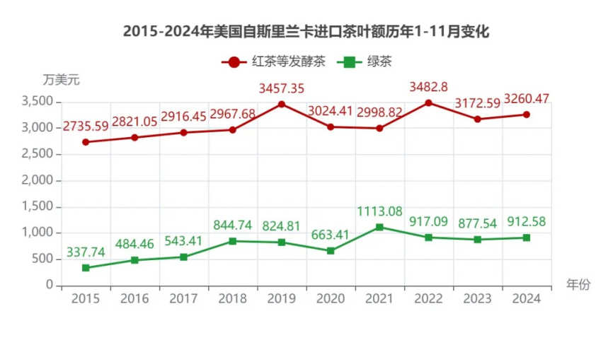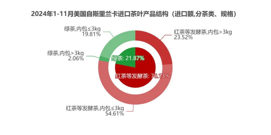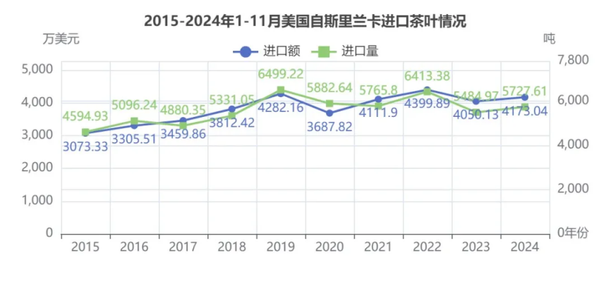 2024年1-11月美国-斯里兰卡茶叶进口额4173.04万美元,位列所有贸易伙伴第5,同比增长3.03%;进口量5727.61吨,在所有贸易伙伴中第5,同比增长4.42%;均价7.29美元/Kg,降幅1.33%。