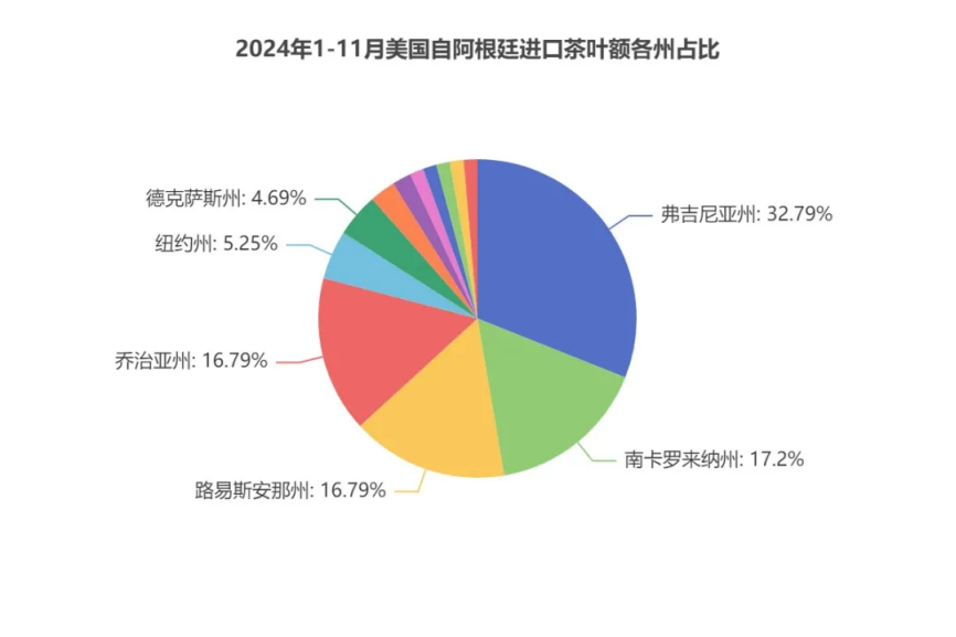 弗吉尼亚州 、南卡罗来纳州 、路易斯安那州 、乔治亚州 、纽约州是2024年1-11月自阿根廷茶叶进口额前5州,分别为1707.22万美元、895.54万美元、874.37万美元、873.97万美元、273.42万美元,合计占茶叶进口规模的88.83%。