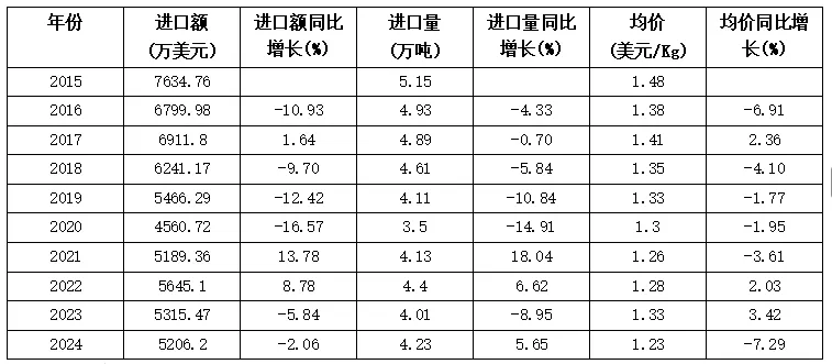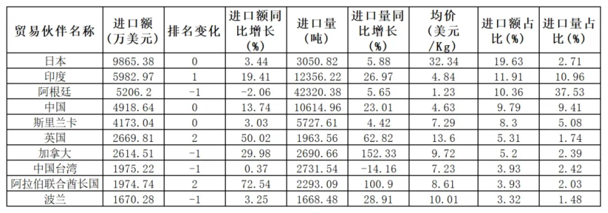 进口量前5贸易伙伴依次为阿根廷 、印度 、中国 、越南 、斯里兰卡,合计占进口规模的65.69%。