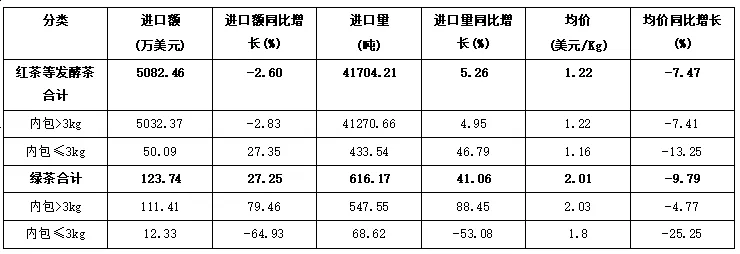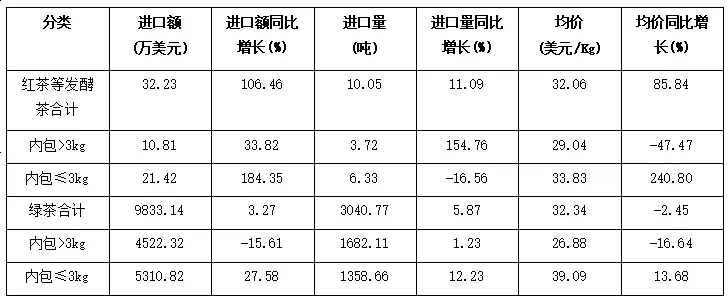 从进口额看,红茶等发酵茶进口额5082.46万美元,占茶叶进口总额的97.62%;绿茶进口额123.74万美元,占2.38%。