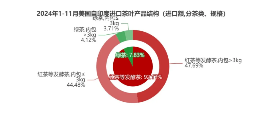纽约州 、乔治亚州 、加利福尼亚州 、伊利诺伊州 、华盛顿州是2024年1-11月自印度茶叶进口额前5州,分别为2064.27万美元、1288.29万美元、883.99万美元、361.92万美元、340.32万美元,合计占茶叶进口规模的82.55%。