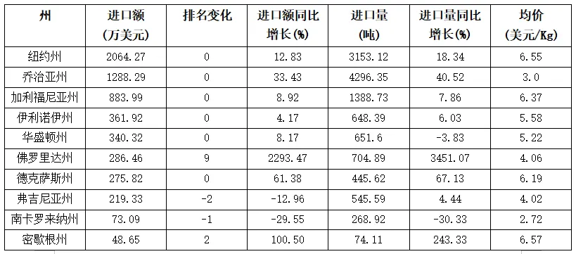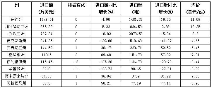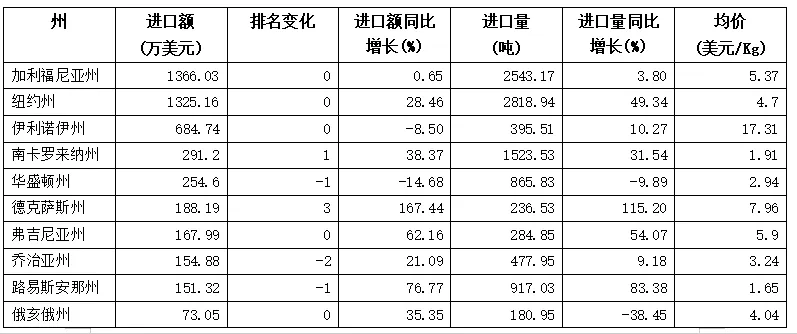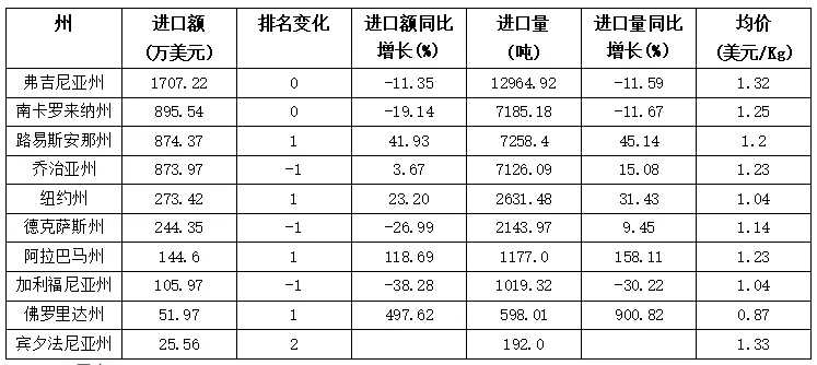 表格 2024年1-11月美国自阿根廷茶叶进口额前10州