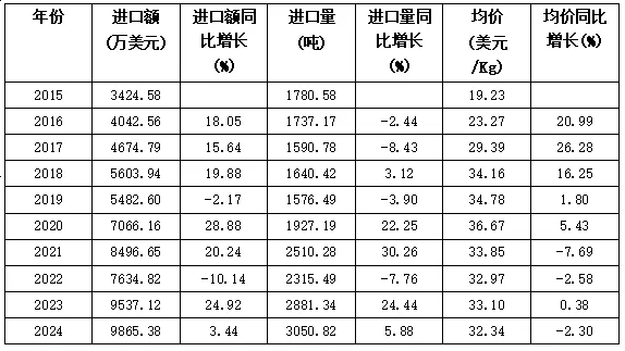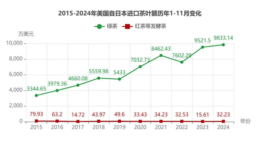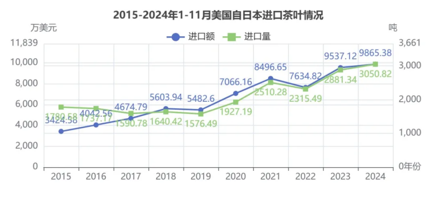 2024年1-11月美国-日本茶叶进口额9865.38万美元,位列所有贸易伙伴第1,同比增长3.44%;进口量3050.82吨,在所有贸易伙伴中第7,同比增长5.88%;均价32.34美元/Kg,降幅2.30%。