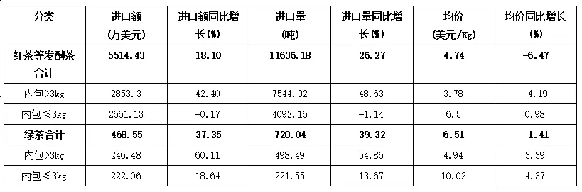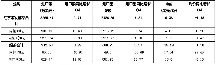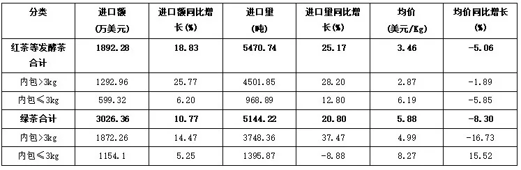 从进口额看,绿茶进口额3026.36万美元,占茶叶进口总额的61.53%;红茶等发酵茶进口额1892.28万美元,占38.47%。