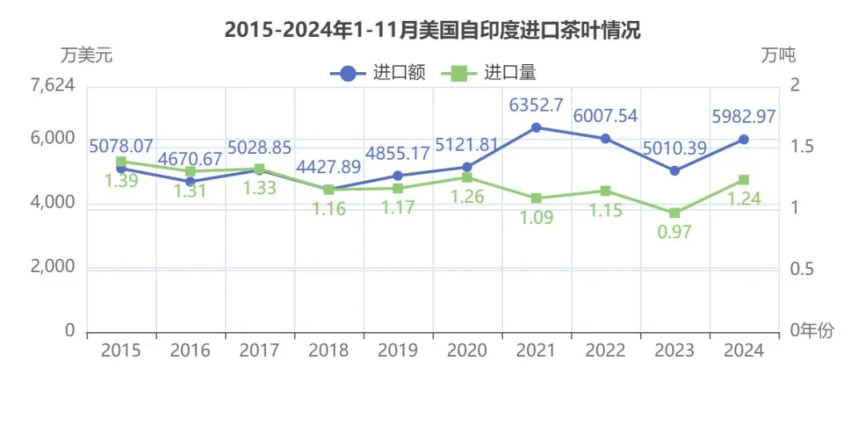 2024年1-11月美国-印度茶叶进口量1.24万吨,在所有贸易伙伴中第2,同比增长26.97%;进口额5982.97万美元,位列所有贸易伙伴第2,同比增长19.41%;均价4.84美元/Kg,降幅5.95%。