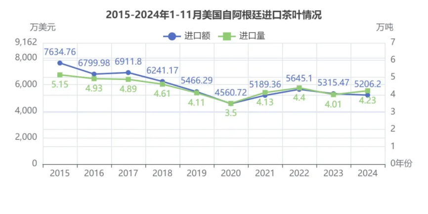 2024年1-11月美国-阿根廷茶叶进口额5206.20万美元,位列所有贸易伙伴第3,同比减少2.06%;进口量4.23万吨,在所有贸易伙伴中第1,同比增长5.65%;均价1.23美元/Kg,降幅7.29%。