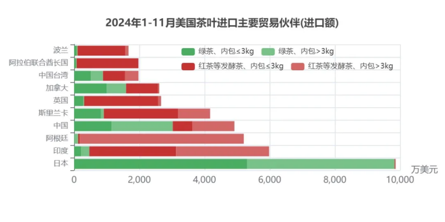 本文将展示2024年1-11月美国茶叶进口贸易伙伴的情况,为国内茶企布局2025年出海战略提供参考。