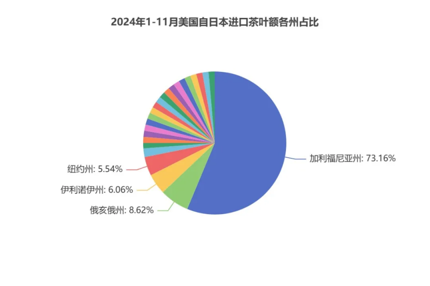 加利福尼亚州 、俄亥俄州 、伊利诺伊州 、纽约州 、华盛顿州是2024年1-11月自日本茶叶进口额前5州,分别为7217.86万美元、850.85万美元、597.75万美元、546.53万美元、249.11万美元,合计占茶叶进口规模的95.91%。
