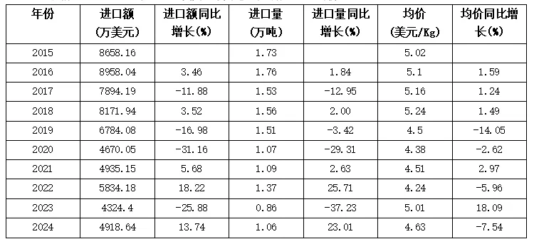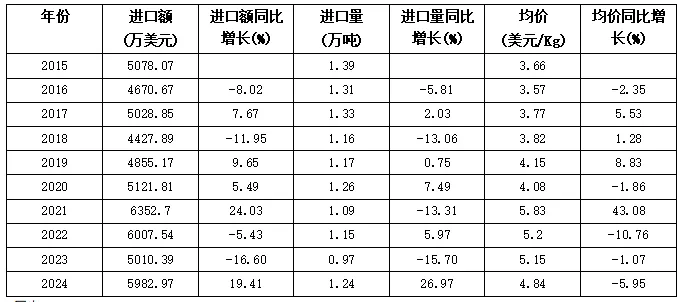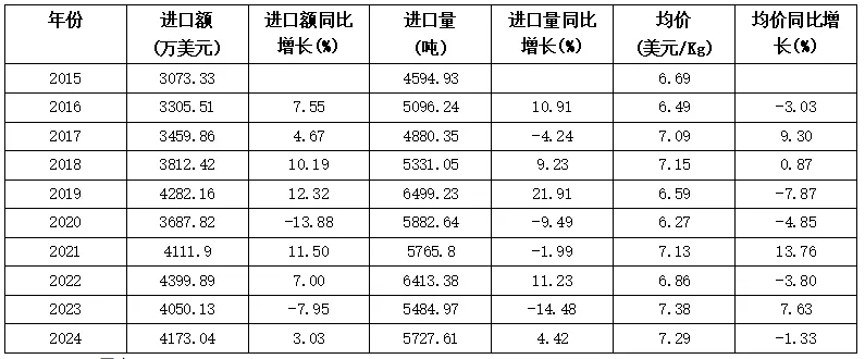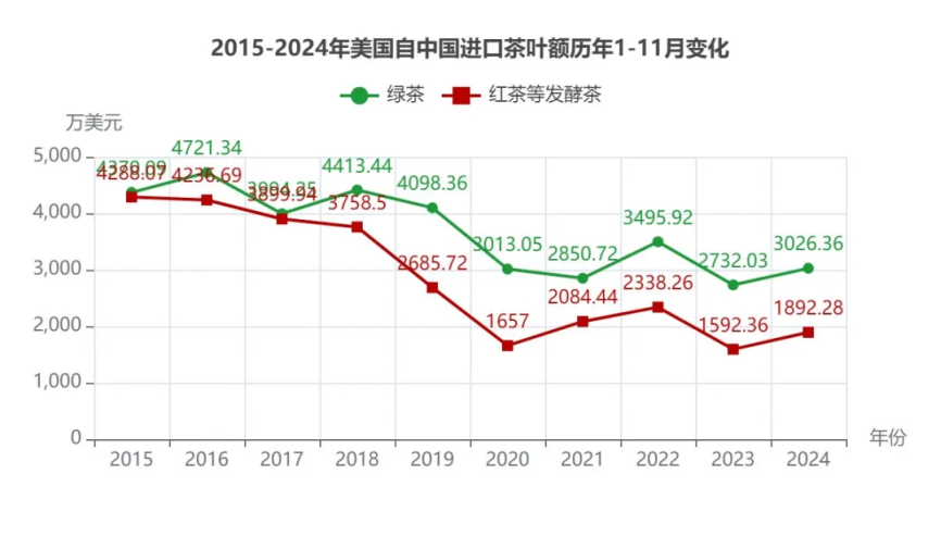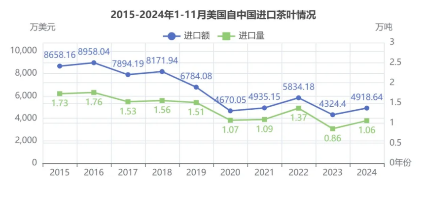表格 2015-2024年1-11月美国自中国进口茶叶额、量、均价