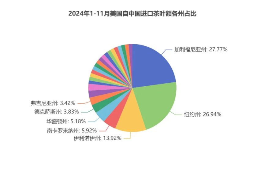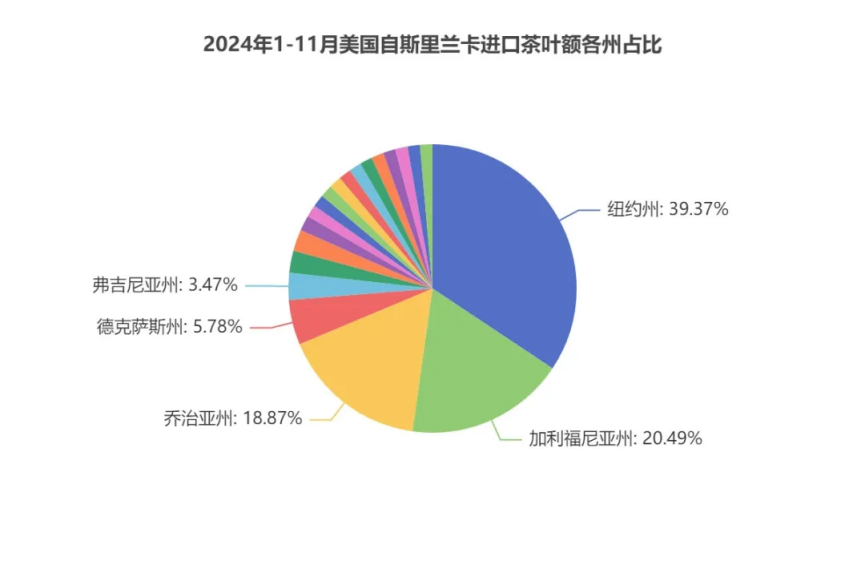纽约州 、加利福尼亚州 、乔治亚州 、德克萨斯州 、弗吉尼亚州为2024年1-11月自斯里兰卡茶叶进口额前5州,分别为1643.04万美元、855.22万美元、787.24万美元、241.26万美元、144.59万美元,合计占茶叶进口规模的87.98%。