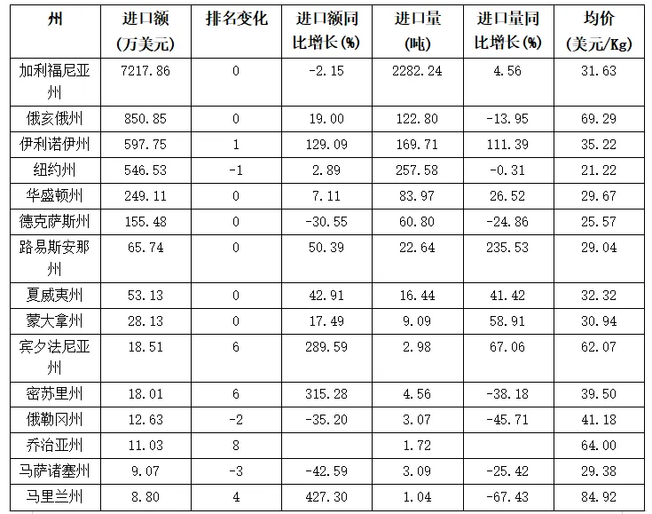 表格 2024年1-11月美国自中国茶叶进口额前10州