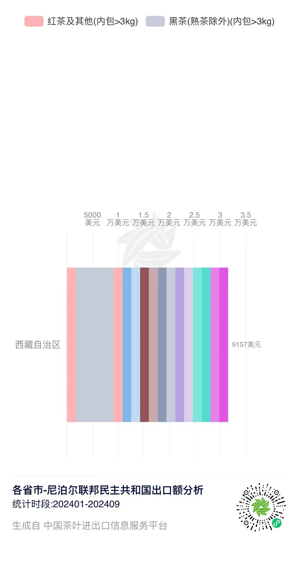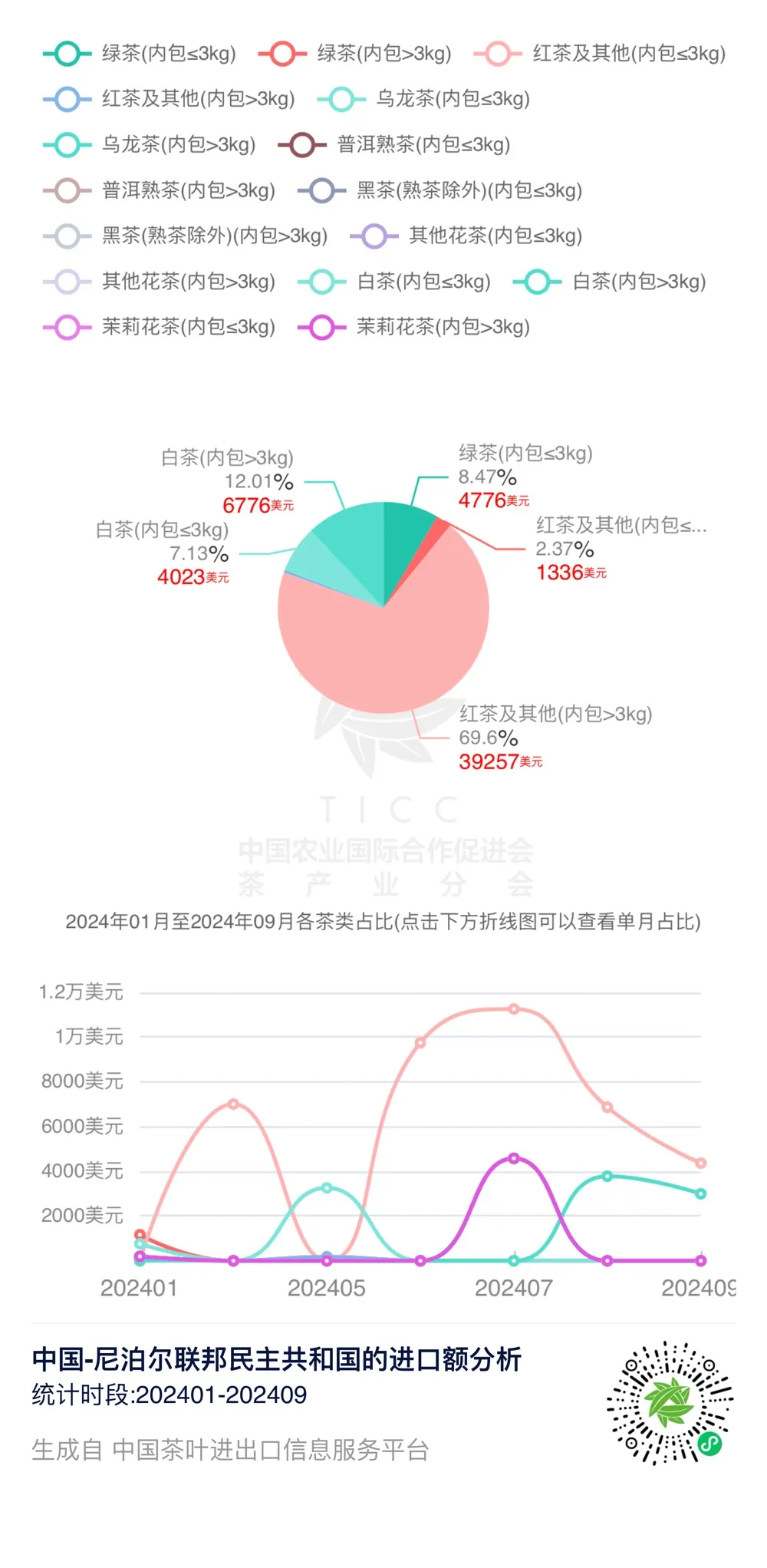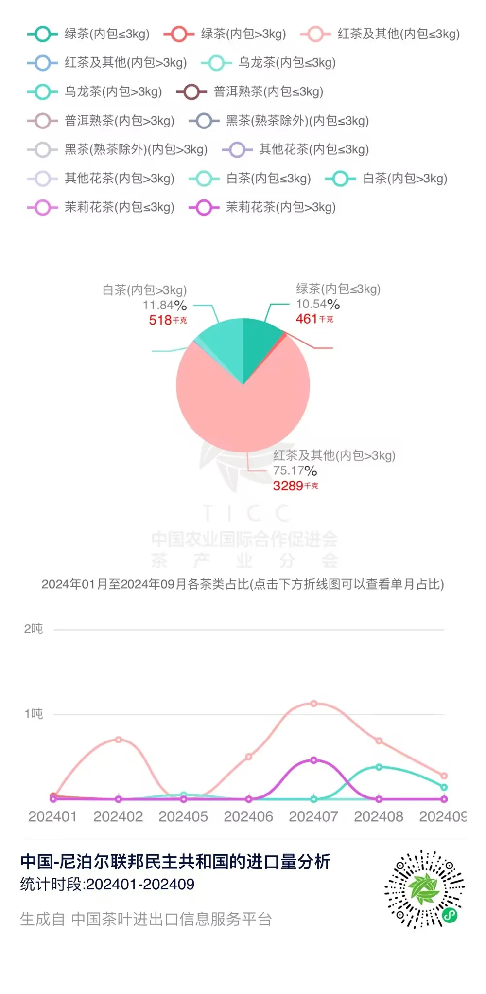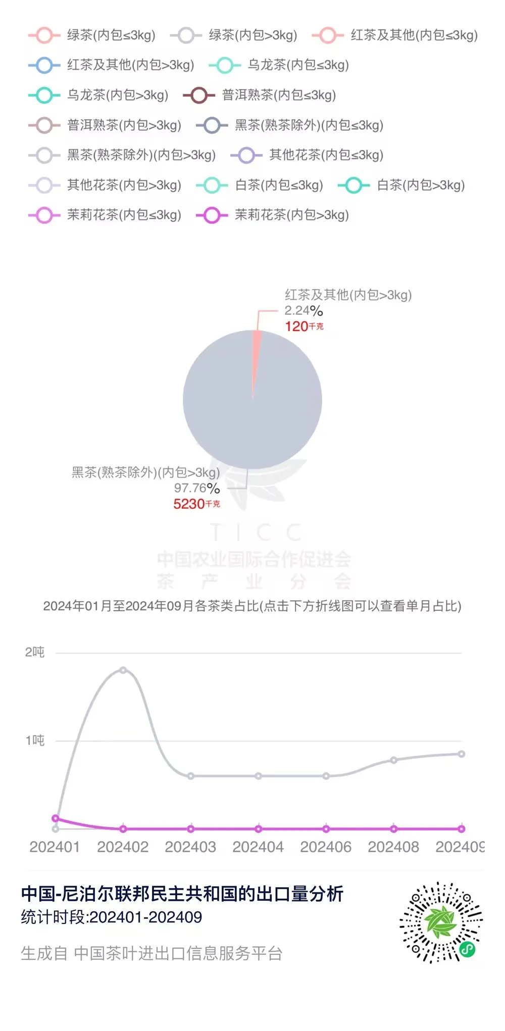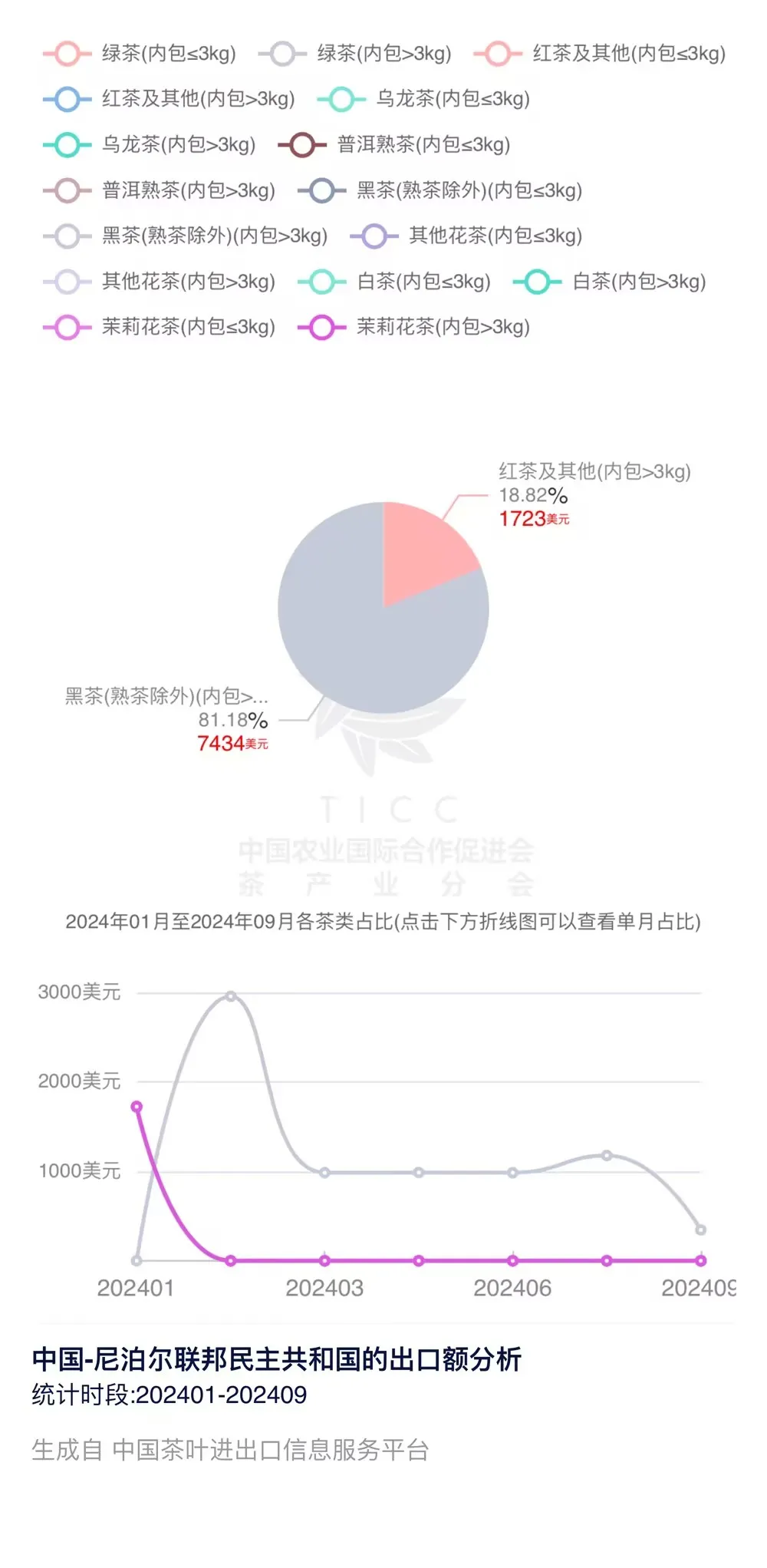 在“中国茶叶进出口信息服务平台”上,我们可以查询到2024年1-9月中国与尼泊尔的茶叶进出口贸易数据。