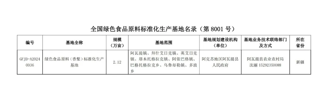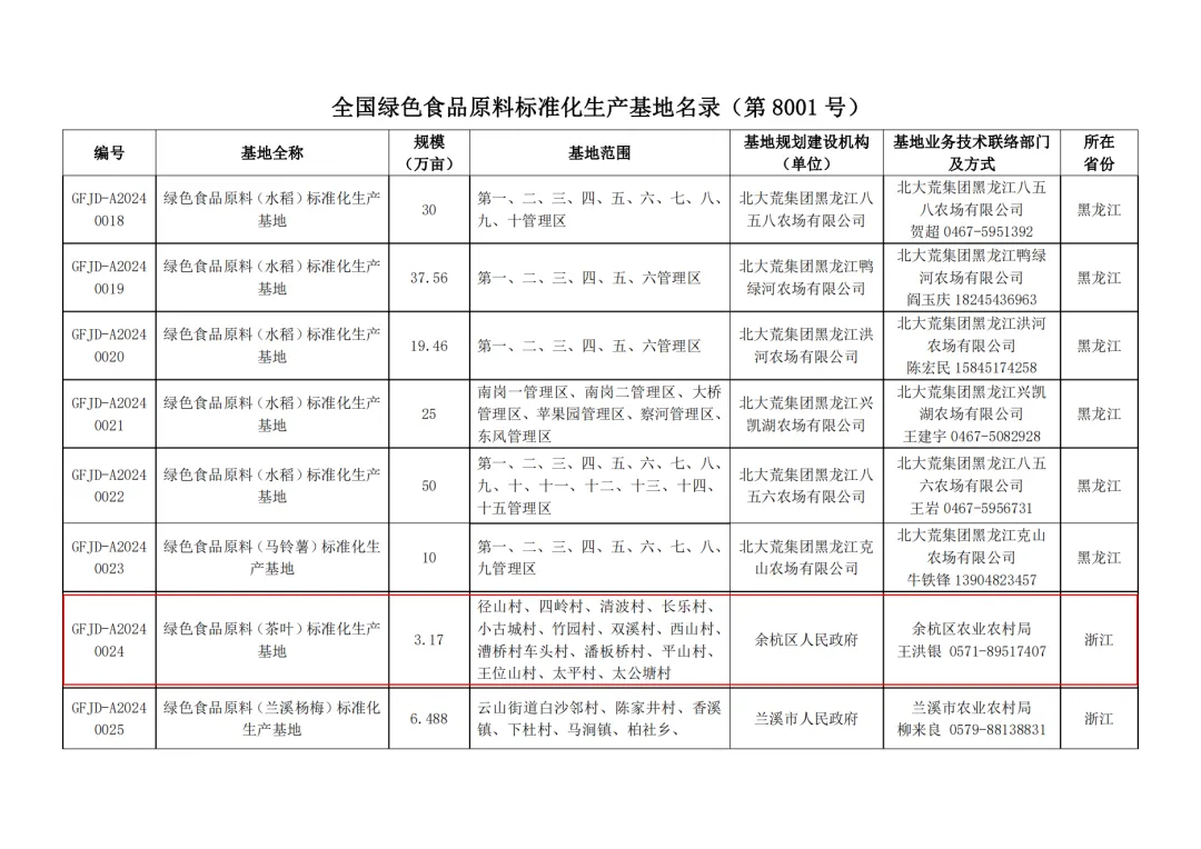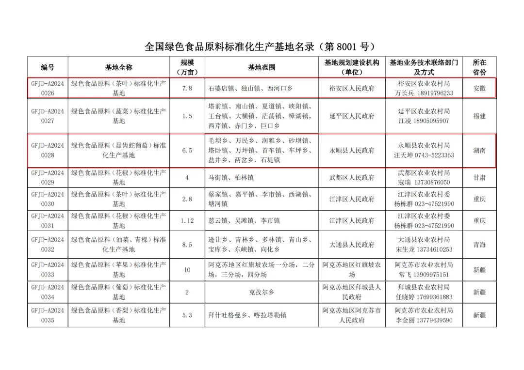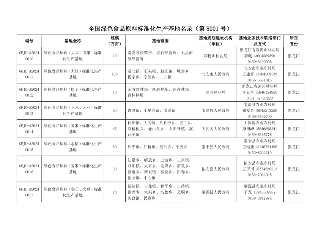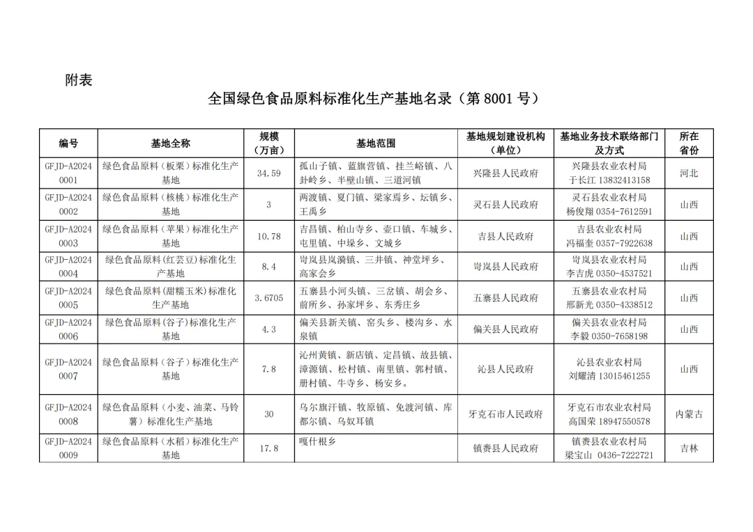 以下为全国绿色食品原料标准化生产基地名录(第8001号)