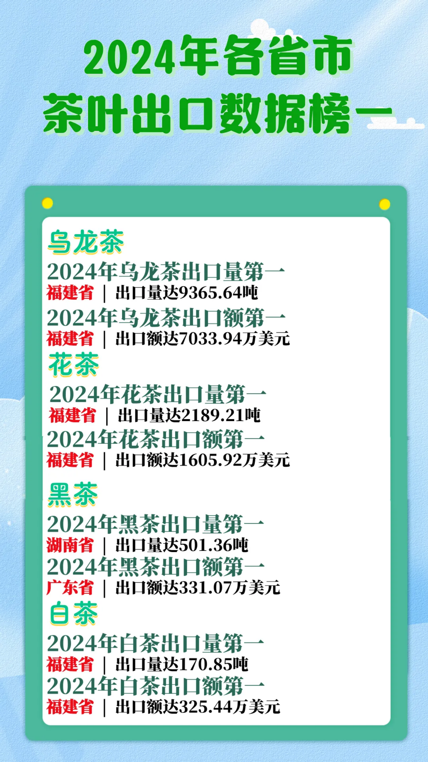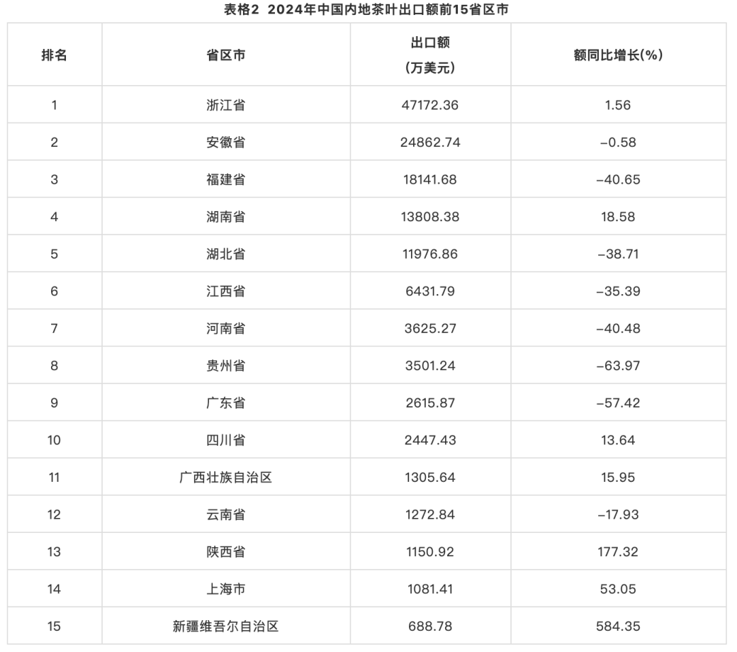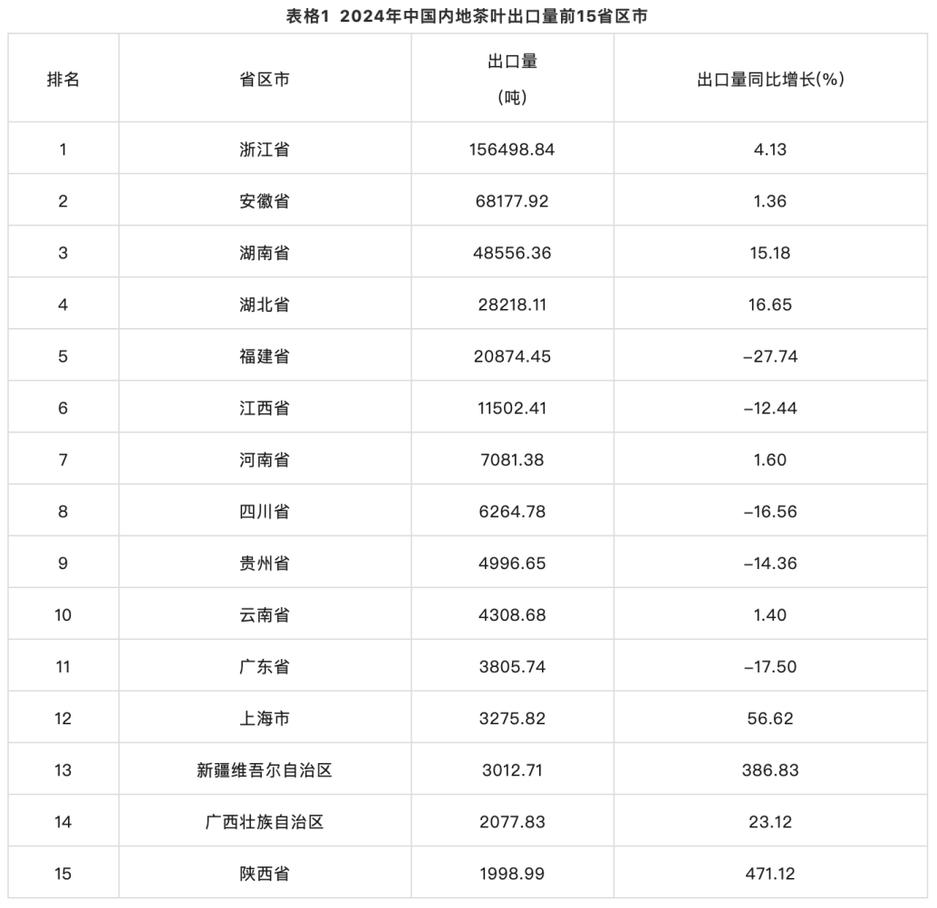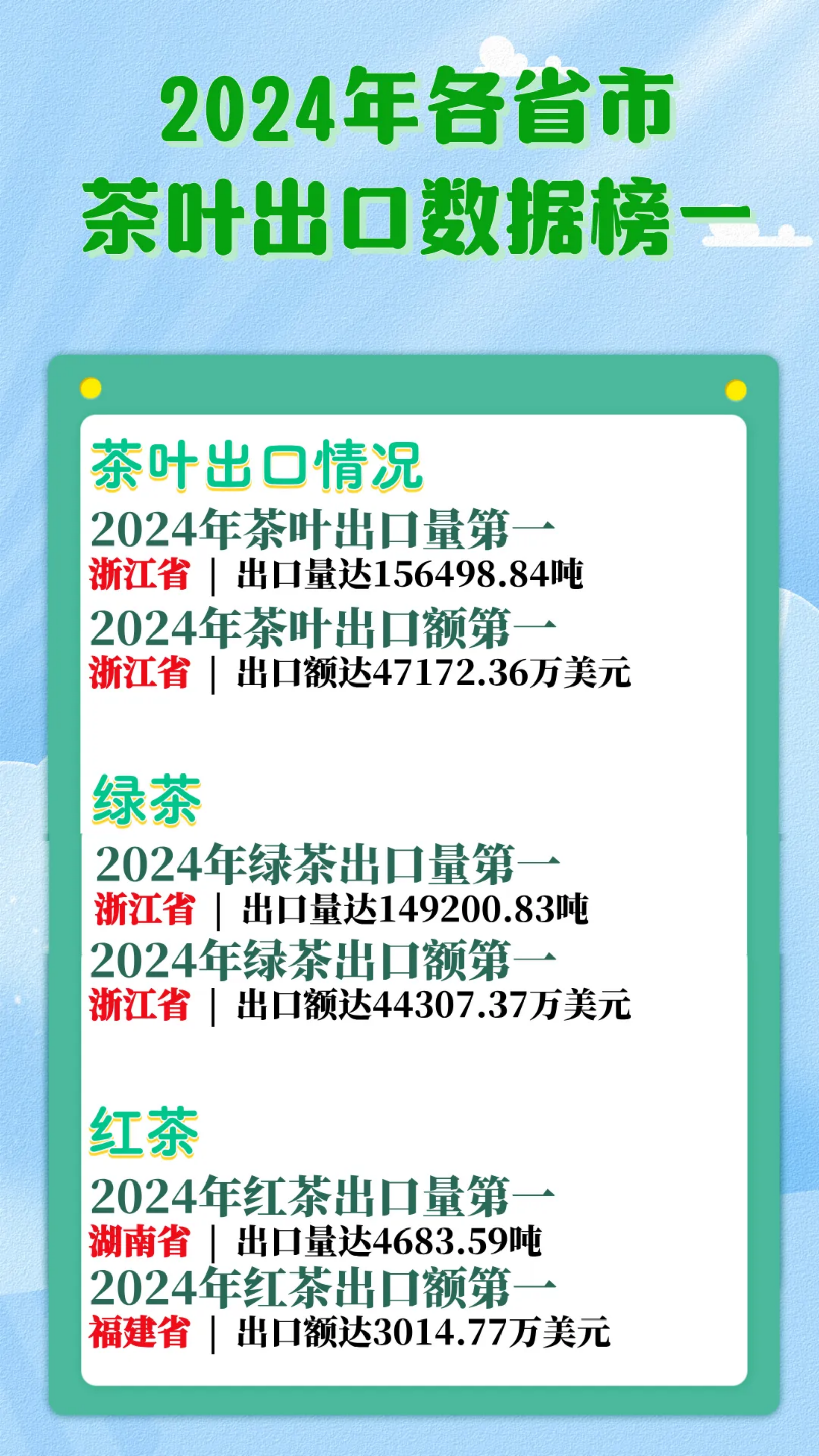 浙江15.6万吨蝉联榜首!2024中国茶叶出口量额各省区市排行揭晓