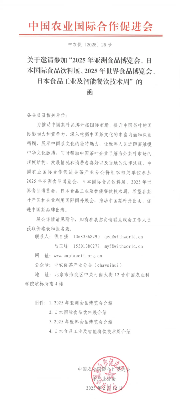 关于邀请参加“2025年亚洲食品博览会、日本国际食品饮料展、2025年世界食品博览会、日本食品工业及智能餐饮技术周”的函