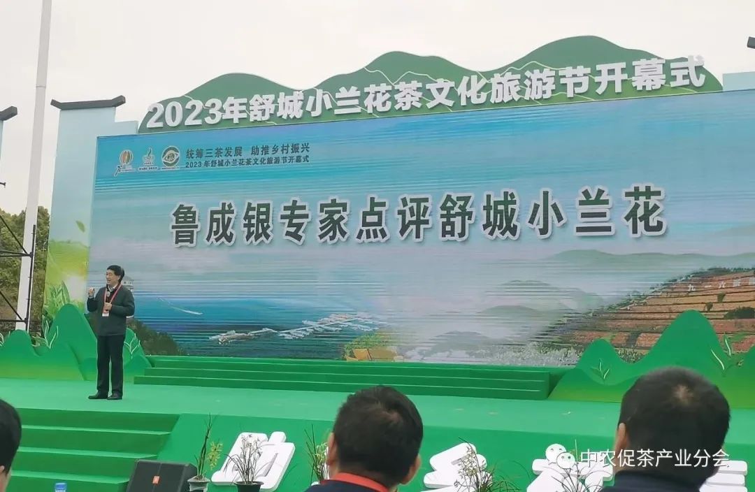 △开幕式上,中国农业科学院茶叶质量与风险评估创新团队首席科学家、中国农业科学院茶叶研究所原副所长、中国农业国际合作促进会茶产业专家委员会副主任委员鲁成银教授点评了“舒城小兰花”茶叶,指出了舒城是世界兰花香型茶叶核心产区,是打造中国兰花香型茶叶第一县,品质独特,有君子风、兰花韵。